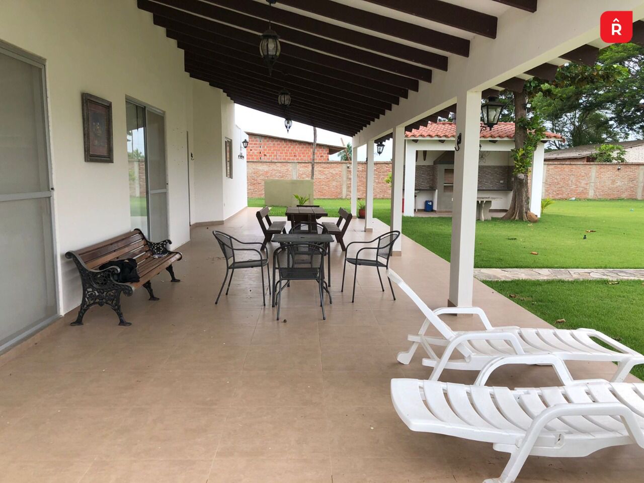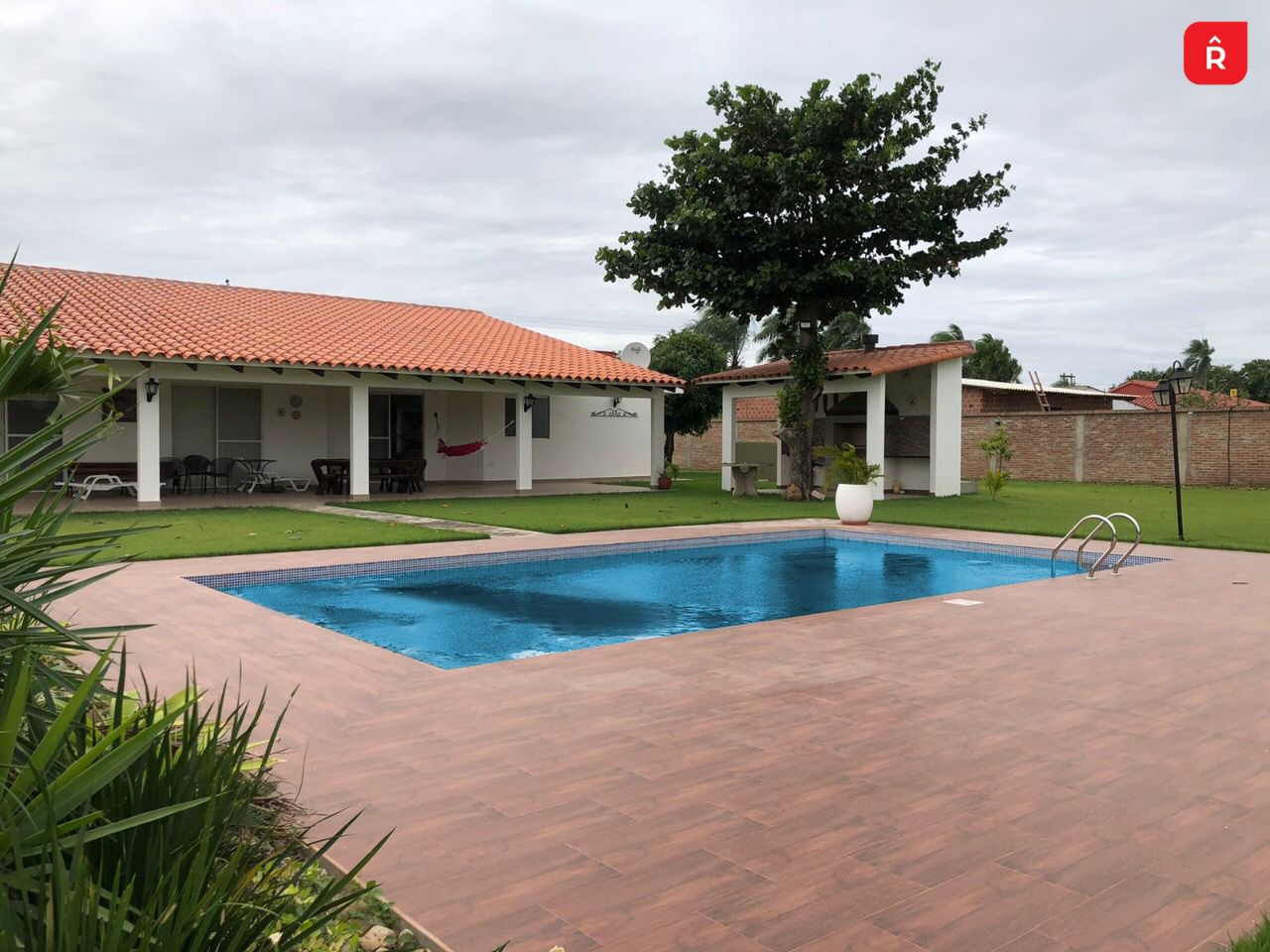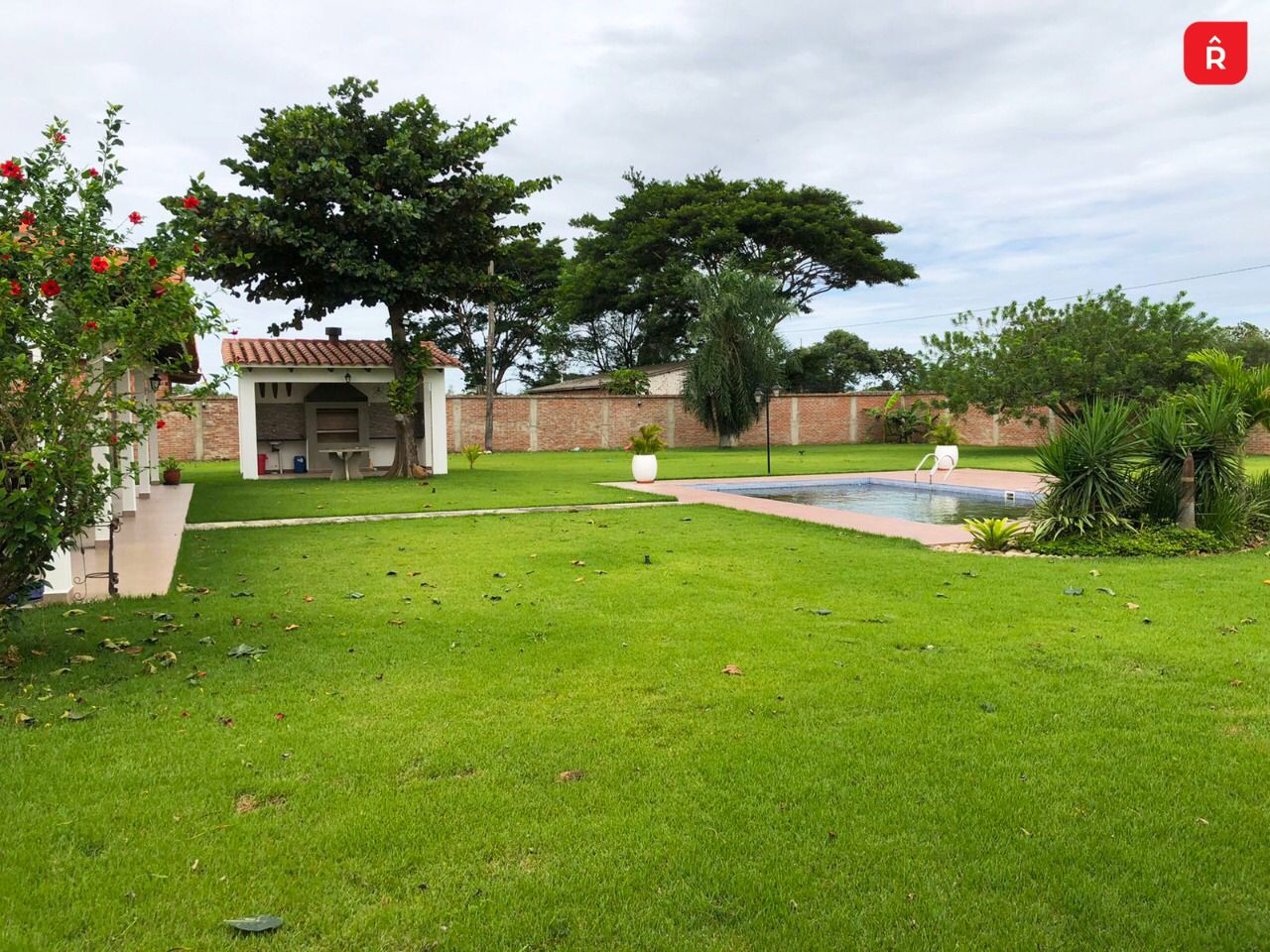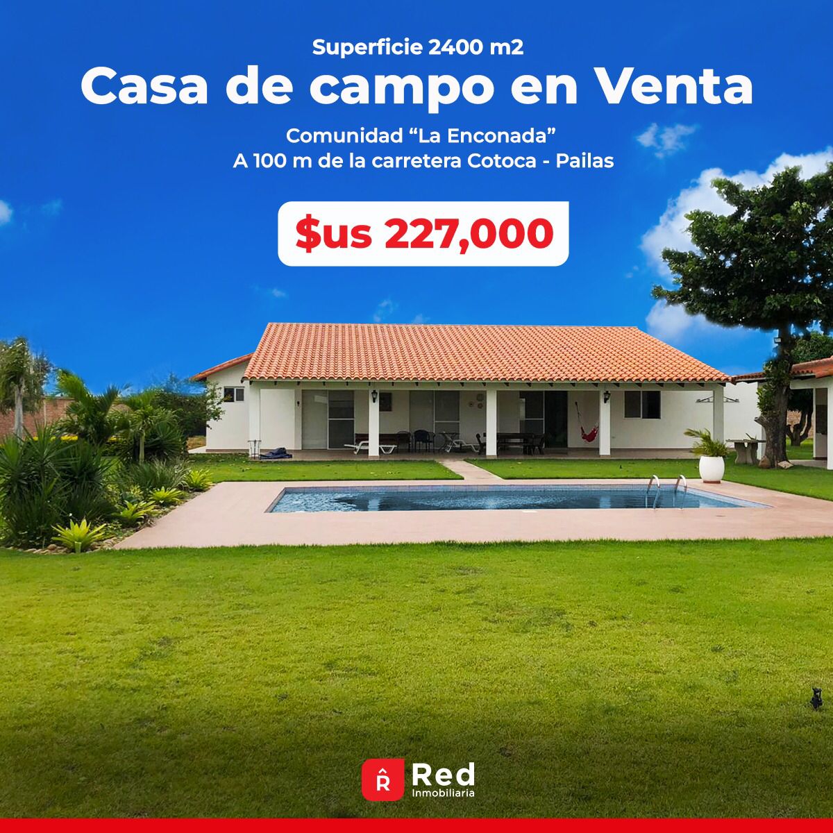 CASA DE CAMPO EN VENTA🔥 – Superficie = 2,400 metros completamente embardados ladrillo visto. – Piscina a estrenar – Amplio jardín con pasto plantado en Tepes….árboles frutales y completamente iluminado con pantallas led y luces en estacas. – Churrasquera de Acero inoxidable techada – Cerca Eléctrica instalada en todo el perímetro de la barda. – Portones metálicos – Amplio Garaje con ladrillo picado – Amplia Cocina Con mesón de mármol, cocina de 4 hornallas y heladera. – Suite principal con baño privado y aire acondicionado, – 3 habitaciones con baño compartido – Suite con baño privado – 2 Baños – Living comedor – Dos ambientes grandes para Salas o comedores internos. – Todo el jardín tiene instalaciones de sistema de riego automático – La casa tiene pozo perforado privado y aparte instalación de agua proveniente de la cooperativa! – La casa quinta está ubicada a 4 cuadras de la plaza principal de la comunidad “La Enconada” y a 100 metros de la carretera Cotoca – Pailas –